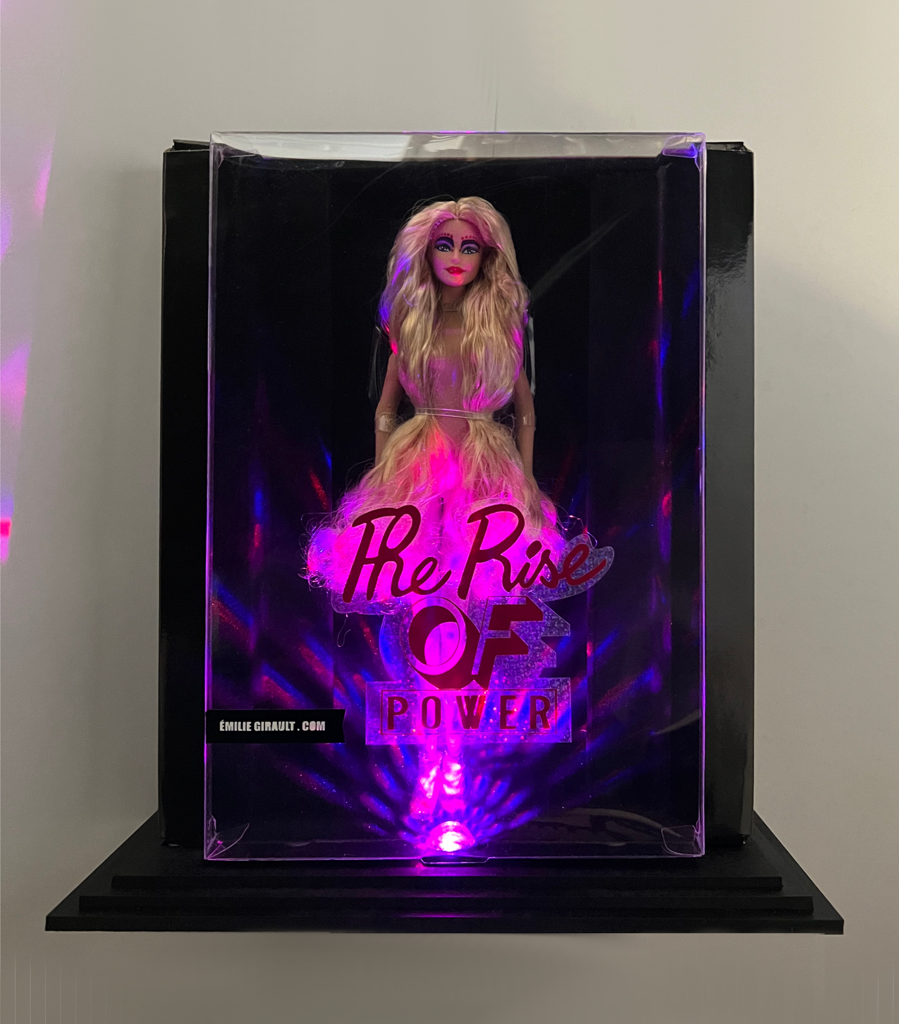 Poupée, peinture acrylique, collant, crêpe de gaze, plastique, paillettes, colle, carton, vinyle, velour, bois, métal, lampe led multicolore.