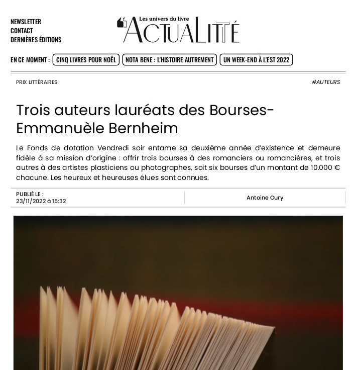 2022 : Article by Antoine Oury in ACTUALITTÉ.COM about the Bourses-Emmanuèle Bernheim.