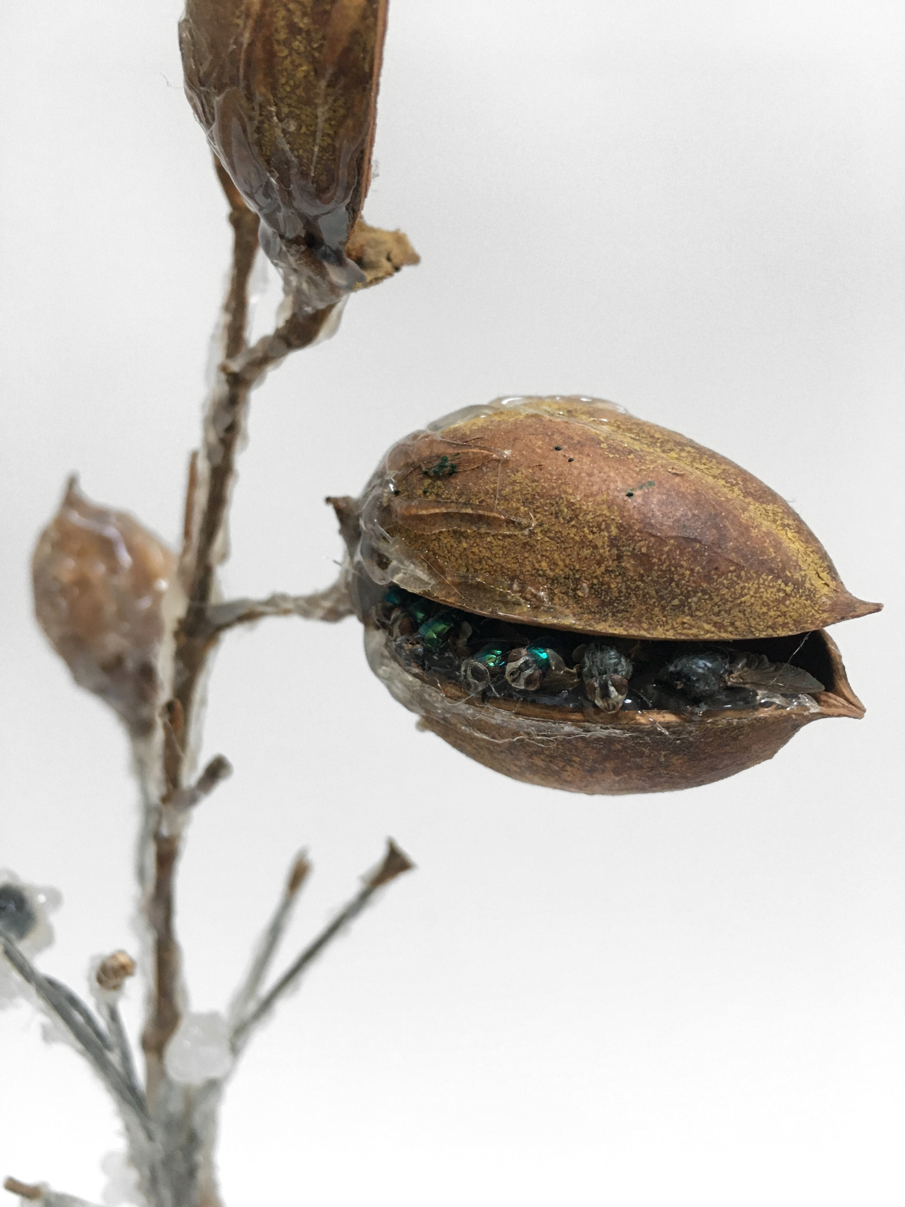 Mouches séchées, cosses de Paulownia et autres végétaux, fer, colle, bille plastique